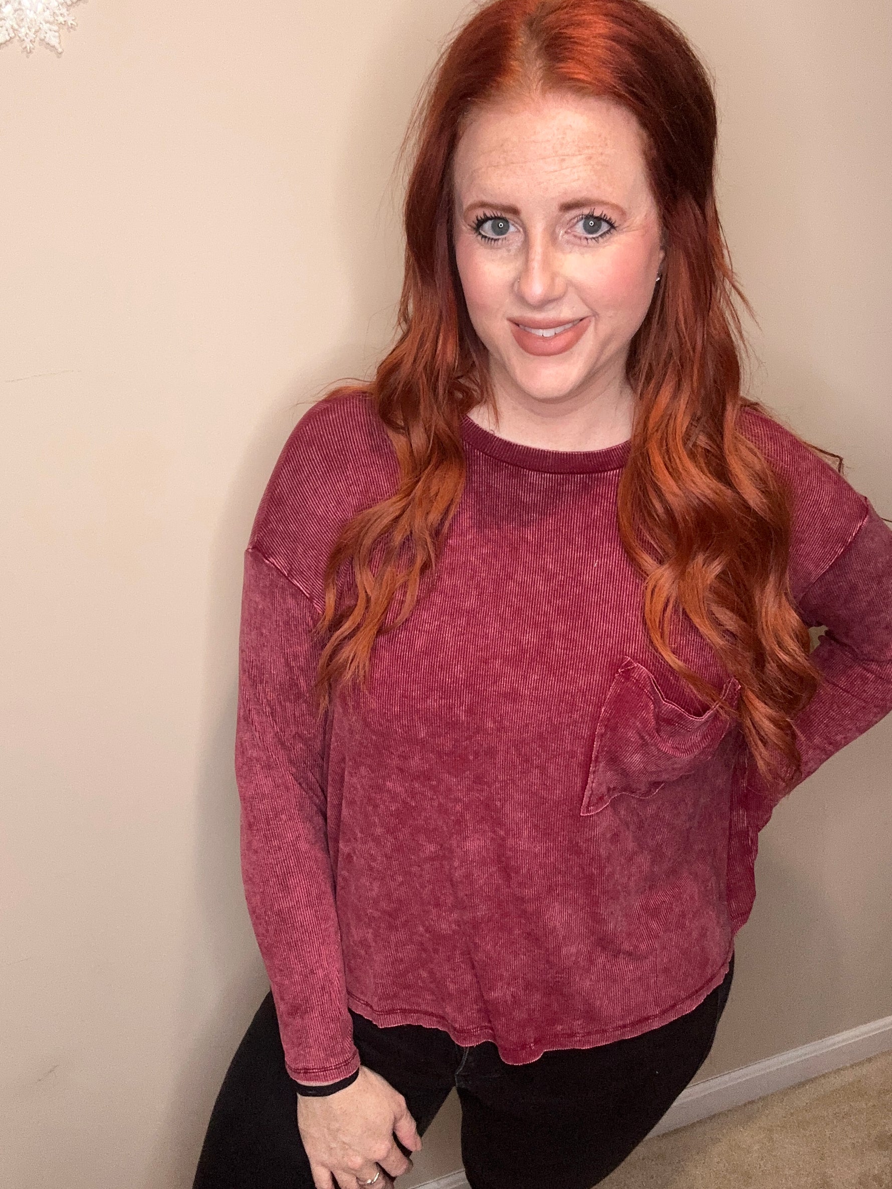 Elevate your casual wardrobe with this washed burgundy long-sleeve top. Designed with a soft ribbed texture and a relaxed fit, it’s perfect for everyday comfort and effortless style. Featuring a chic chest pocket and a vintage-inspired washed finish, this versatile piece pairs beautifully with jeans or leggings for a cozy yet stylish look.