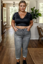 Elevate your denim game with the Dusty Charcoal - Judy Blue Capris. Crafted with a button fly and great stretch, these non-distressed capris can be worn cuffed or un-cuffed for extra length. The washed denim grey color adds a touch of sophistication to any outfit. Perfect for those who like to have fun with their style!