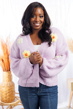 Treat yourself to this warm and cozy Hop Into Spring - Cardigan! An extra-chunky knit with a comfy slouchy fit and long balloon sleeves is topped with cute and colorful knit flowers, plus a classic v-neck with a sweet button closure. Snuggle up!