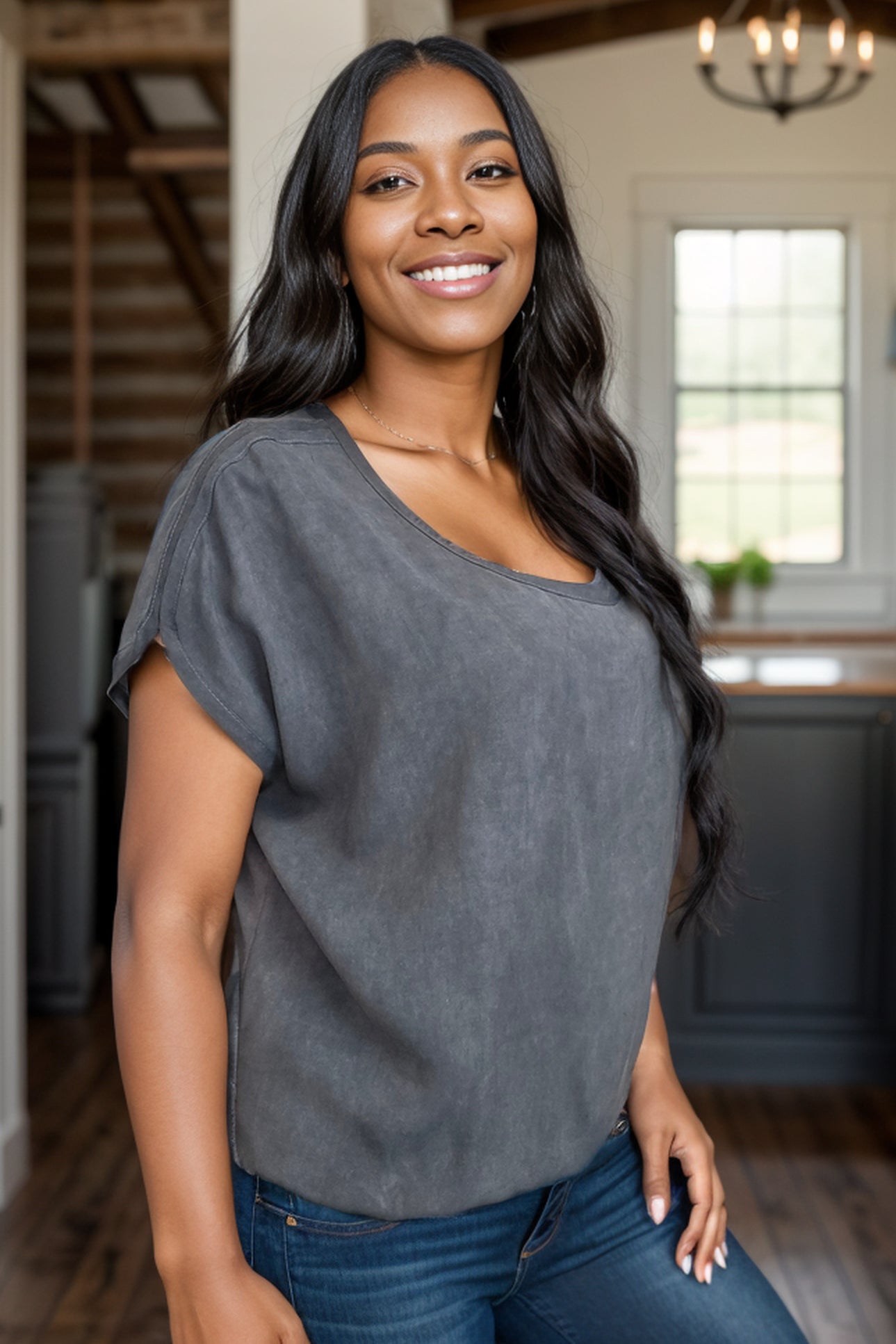 Sizzle in style with the Smokey Evenings short sleeve. This playful top in charcoal grey features a flattering scoop neck and banded hem for a casual yet chic look. Made from comfortable woven fabric, it's perfect for any occasion. (No need to stay in on warm nights.)