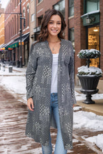 Unleash your wild side with this long grey Subtle Contrast Duster. The open front and soft fabric make it perfect for layering, while the subtle aztec details add a touch of adventure to your wardrobe. Get ready to stand out (but in a subtle way).