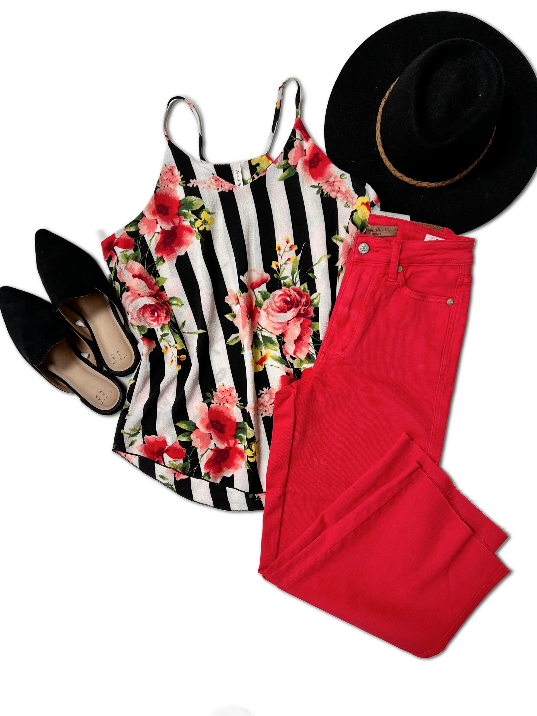 Scarlette Rose - Judy Blue Tummy Control CropsIntroducing Scarlette Rose's Judy Blue Tummy Control Crops - high waisted with a tummy control panel for a flattering fit. These crops feature great stretch for all-day comfort and a wide crop leg with a raw hem for a trendy twist. Available in striking red.