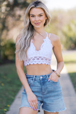 Introducing the Ivory Whisper Bralette, your new go-to for all-day comfort. Featuring a beautiful crochet lace design and pull-over style, this long line bralette provides the perfect amount of stretch for a flawless fit. With a v neckline, removable bra pads, and adjustable criss-cross straps at the back, this bralette is both functional and stylish. Say goodbye to boring undergarments and hello to this quirky and fun addition to your wardrobe.