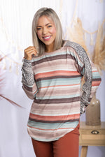 Catch the eye of everyone in the room with the Nashville Sunsets Long Sleeve. Made with a round neck and button detail on the cuff, this vibrant top is sure to be your wildest look yet! You'll love the contrasting animal print and stripes that'll make you strut with style.