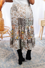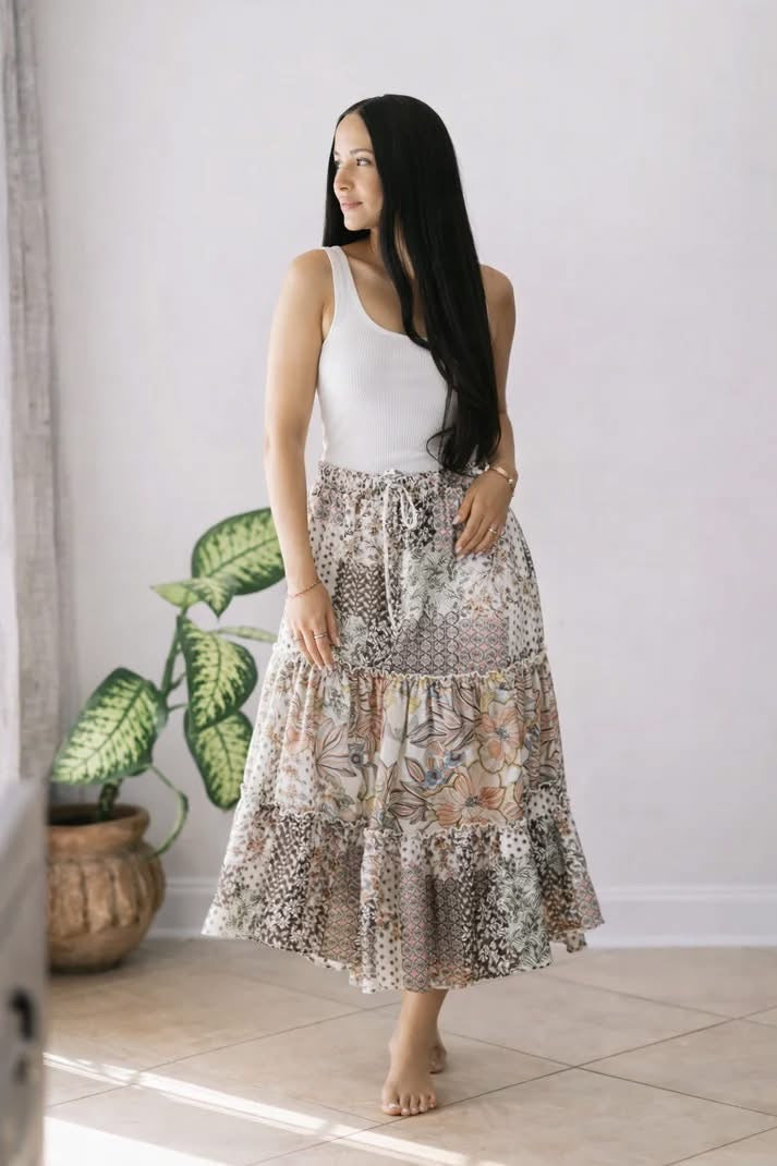 Look fresh and chic in this midi skirt featuring a high waist, elastic waist with self tie, and a tiered ruffle hem. The floral and patchwork pattern gives it a playful and fun vibe. Perfect for everyday - tie it up and hit the town!