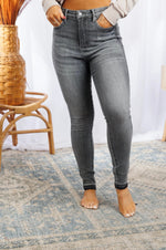 Feel your best in these grey stretchy Judy Blue Skinny Jeans! Distressed coloring with a raw hem.