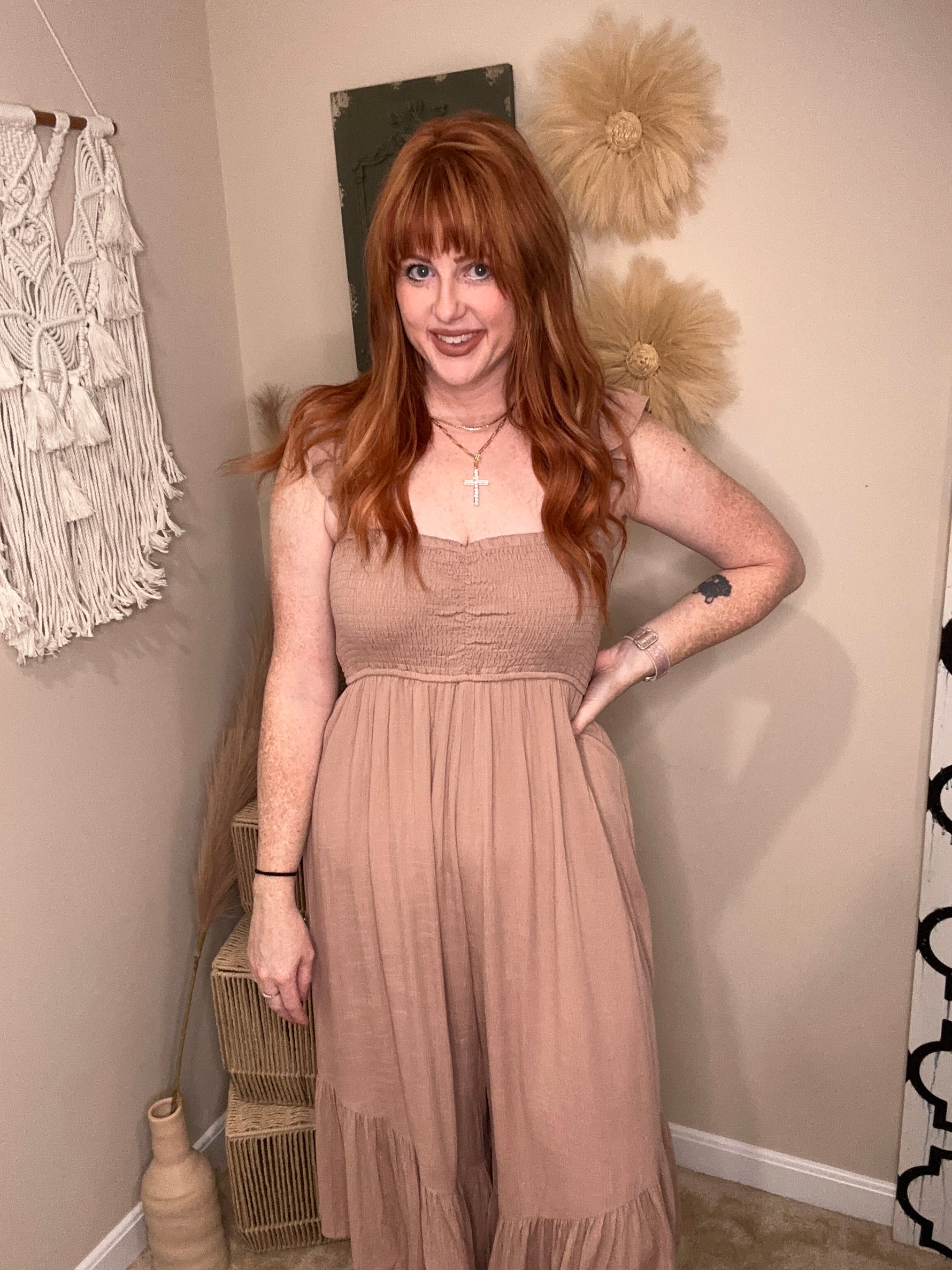 Be the epitome of bohemian comfort in the Boho Bliss Wide-Leg Jumpsuit. With a smocked bodice and ruffle elastic trim, this jumpsuit offers a relaxed fit and flowy silhouette for ultimate comfort. Lined through the bottom pants, it is made with flowy woven fabrication for a feminine and easy look.