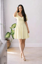 Rock the spring vibes in our Songs of Spring Romper Dress! With a delicate pale yellow hue, sweetheart neckline, and playful short bell sleeves, you'll be turning heads all season long. Plus, stay comfortable and worry-free with built-in shorts. Perfect for any spring occasion!
