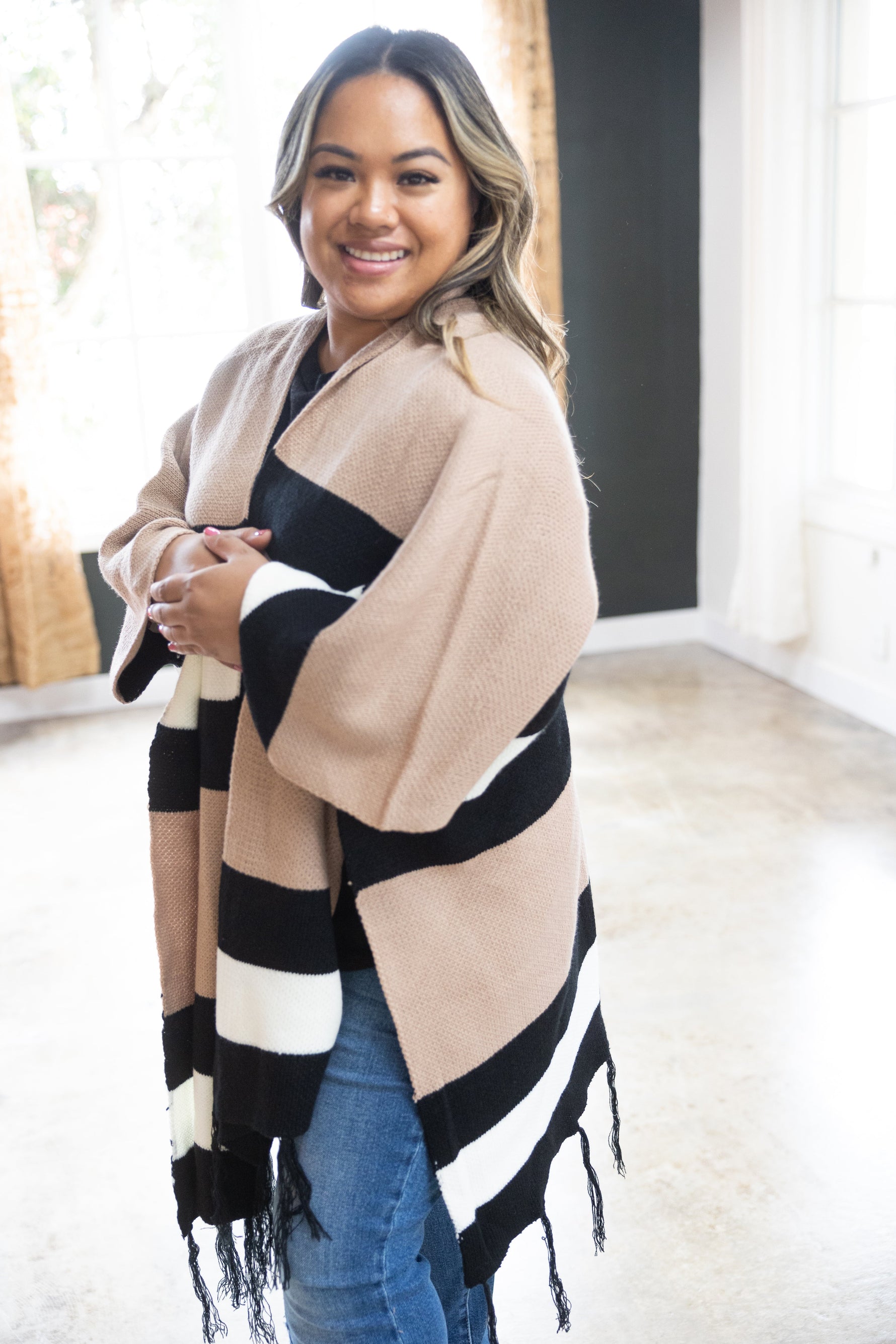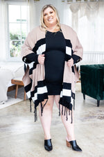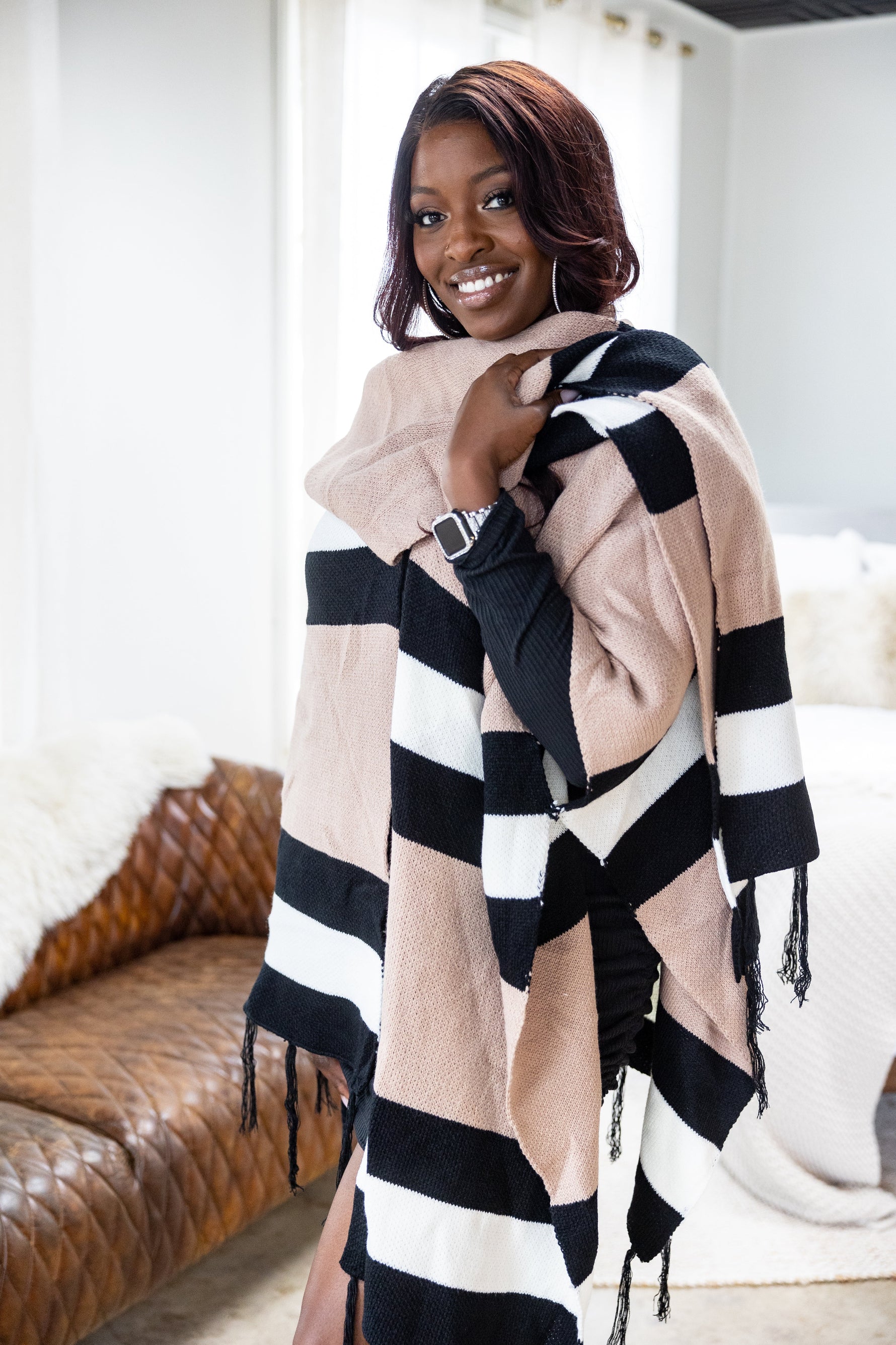 Make the world do a double take with this poncho! It's perfect to wear over just about anything! Frayed at the bottom for extra double takes & rust color blocked stripes with two sets of black stripes surrounding two individual white stripes on the front, with similar or near identical back details!