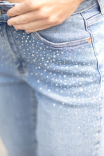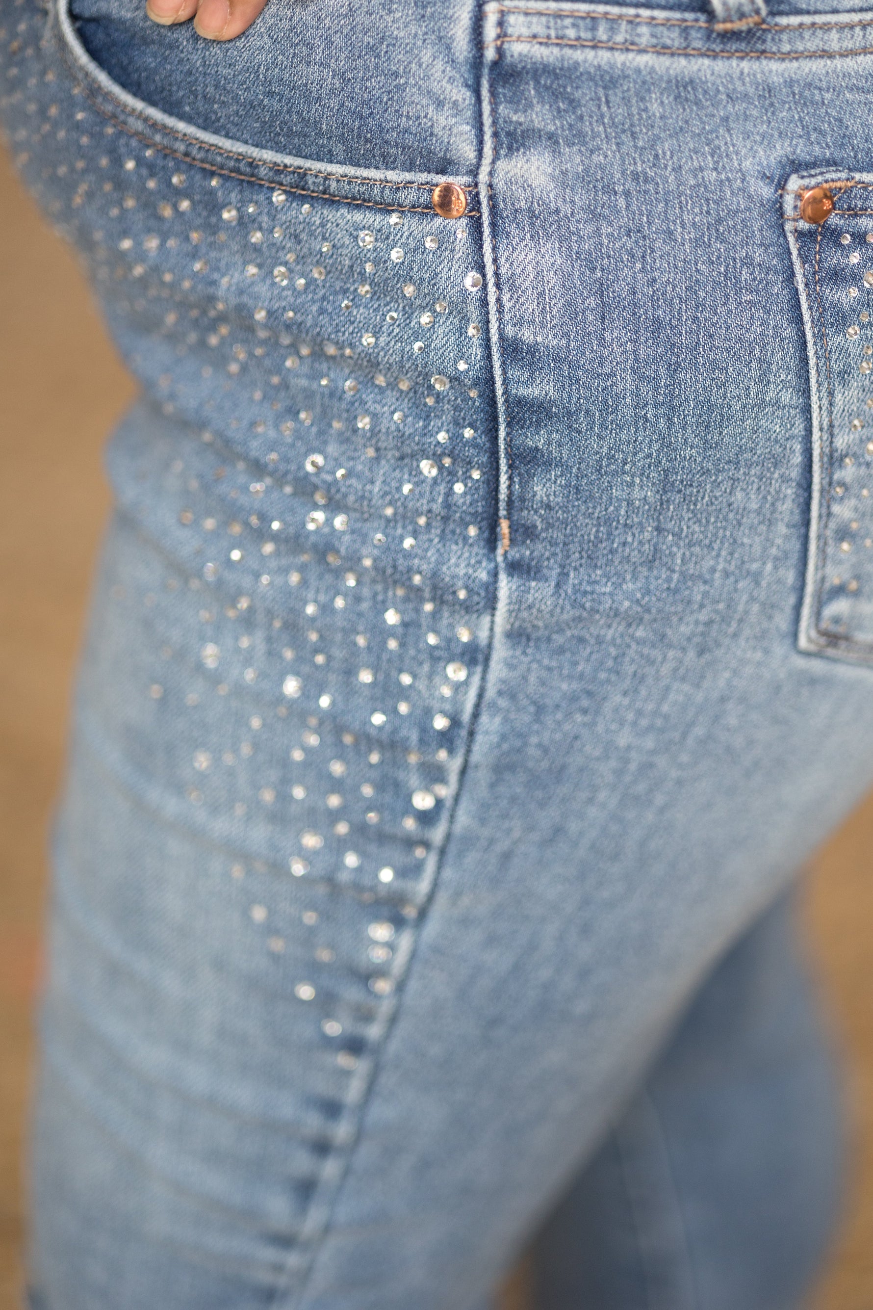 Add a little bit of flare to your life with these Judy Blue Jeans. With classic Judy blue stretch, these medium wash flare jeans have slight distressing and stunning rhinestone details. Run...don't walk to these as they will not last.