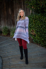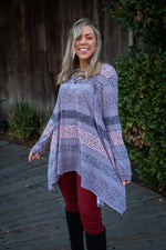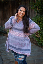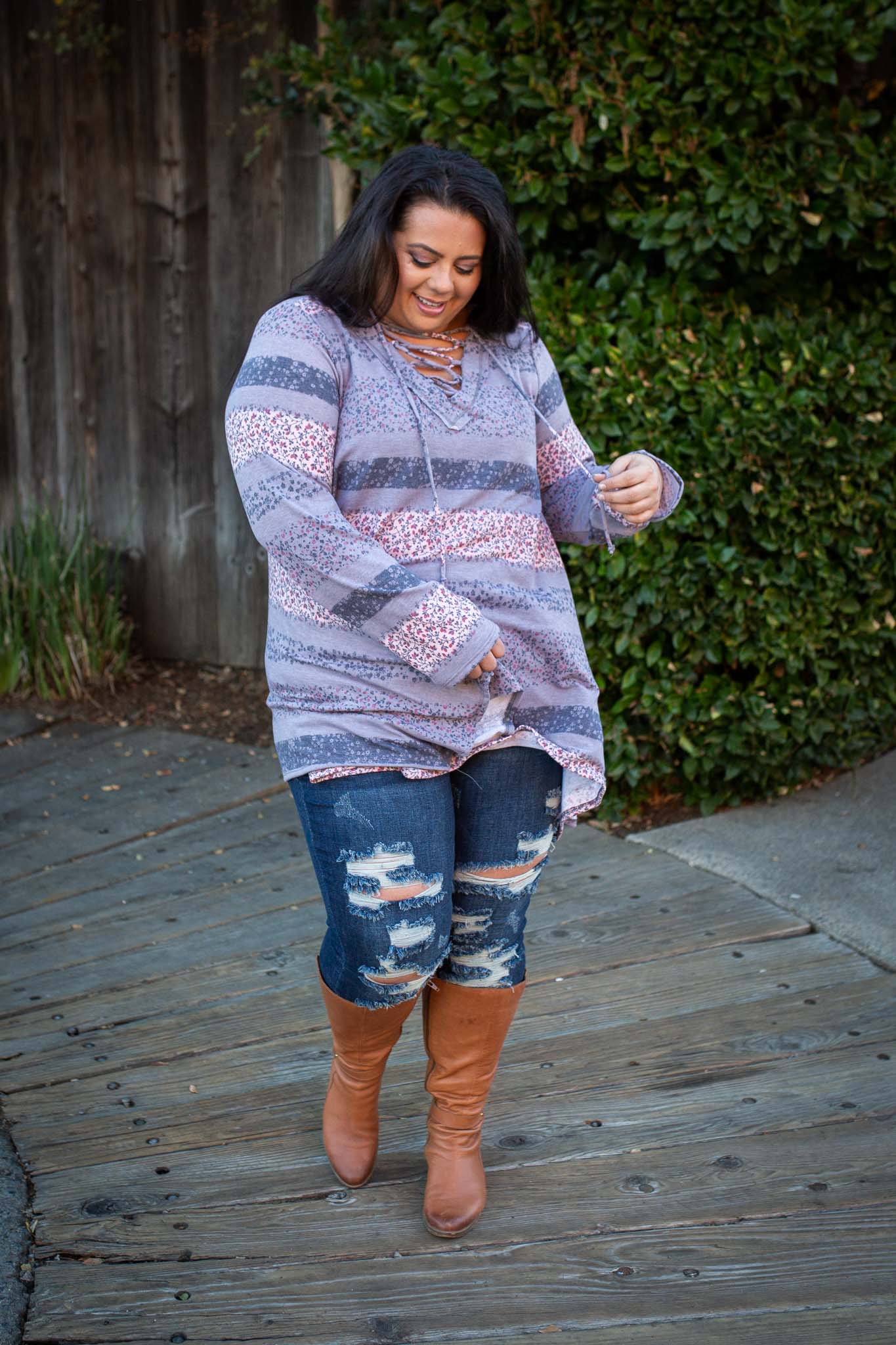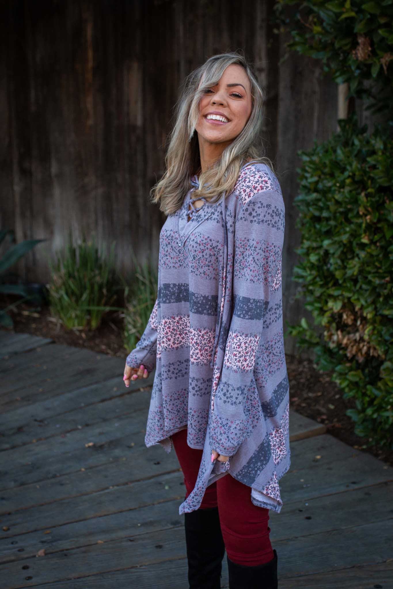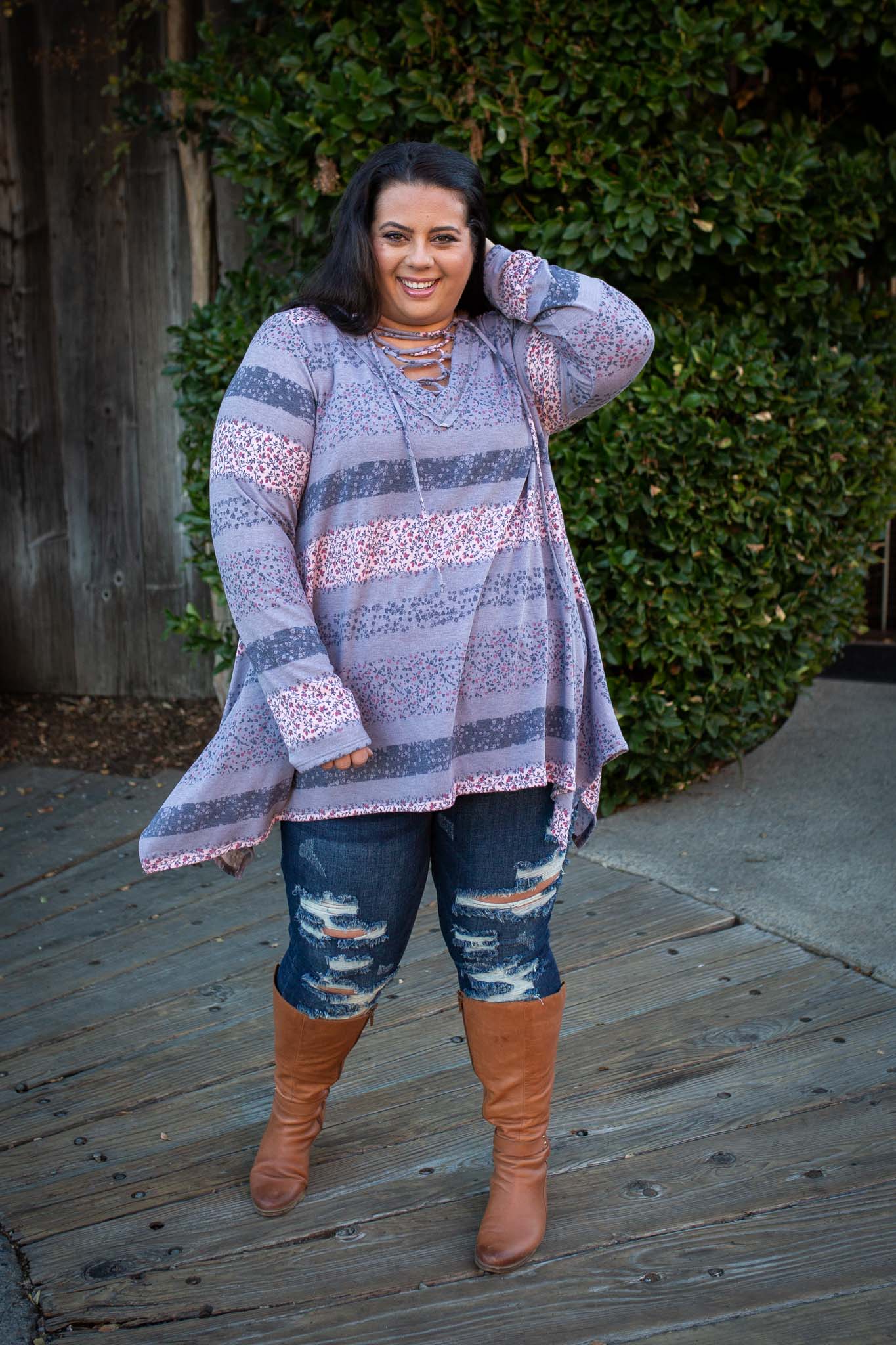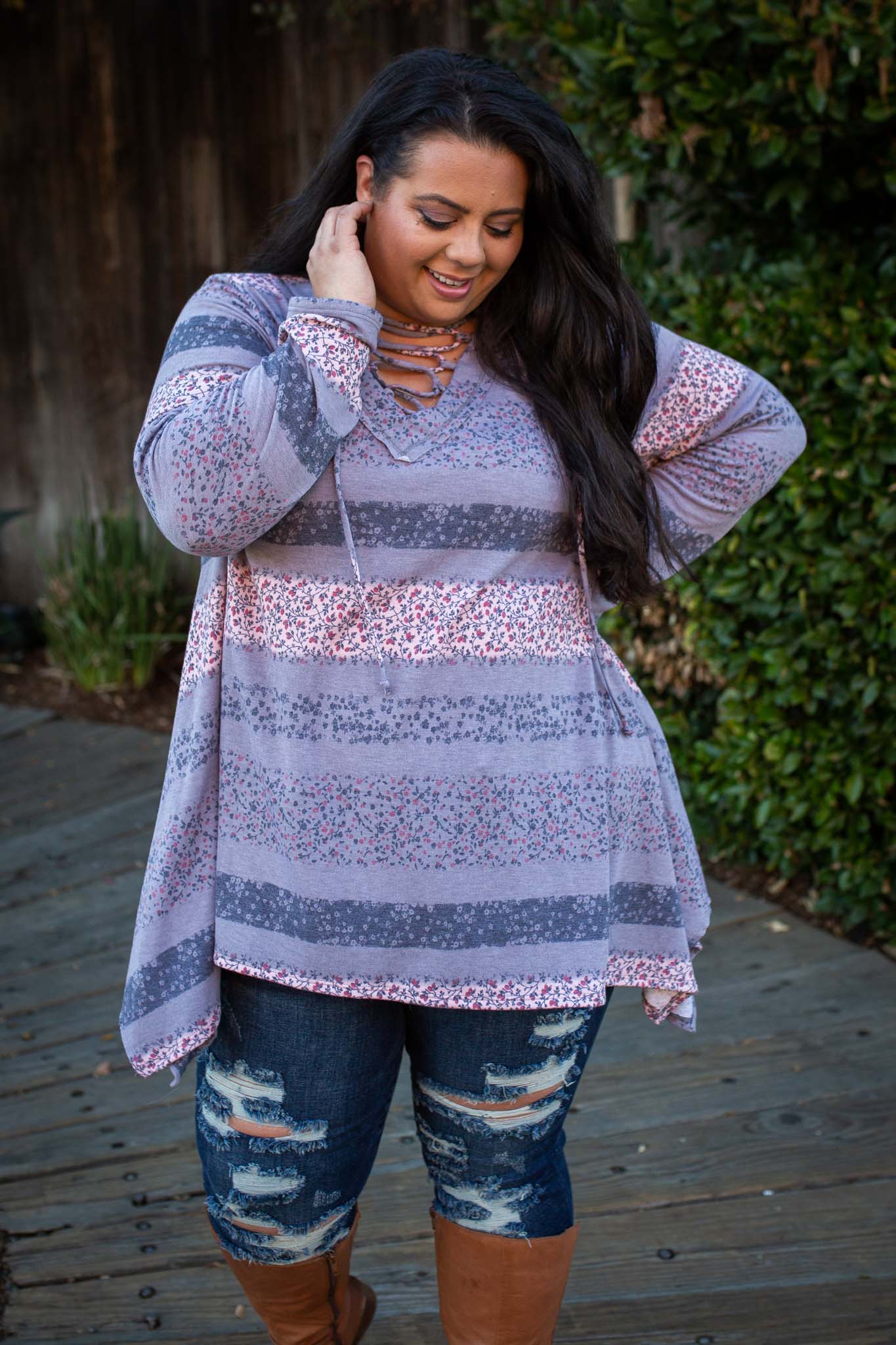 We are loving this long sleeve tunic. The floral stripes are perfect for any season! Featuring a sharkbite hem, loose fit and lace up neck detail, this top will pair perfect leggings or skinnies.