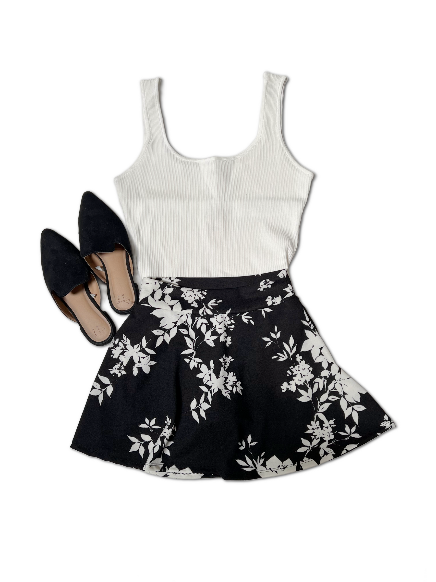Get the best of both worlds with our Heavenly Floral Skirt! This unique skirt features a comfortable yoga waist band for all-day wear, while the flair style and black with white floral print add a touch of elegance and whimsy. Perfect for any occasion, this skirt is a must-have for any fashion-forward individual.