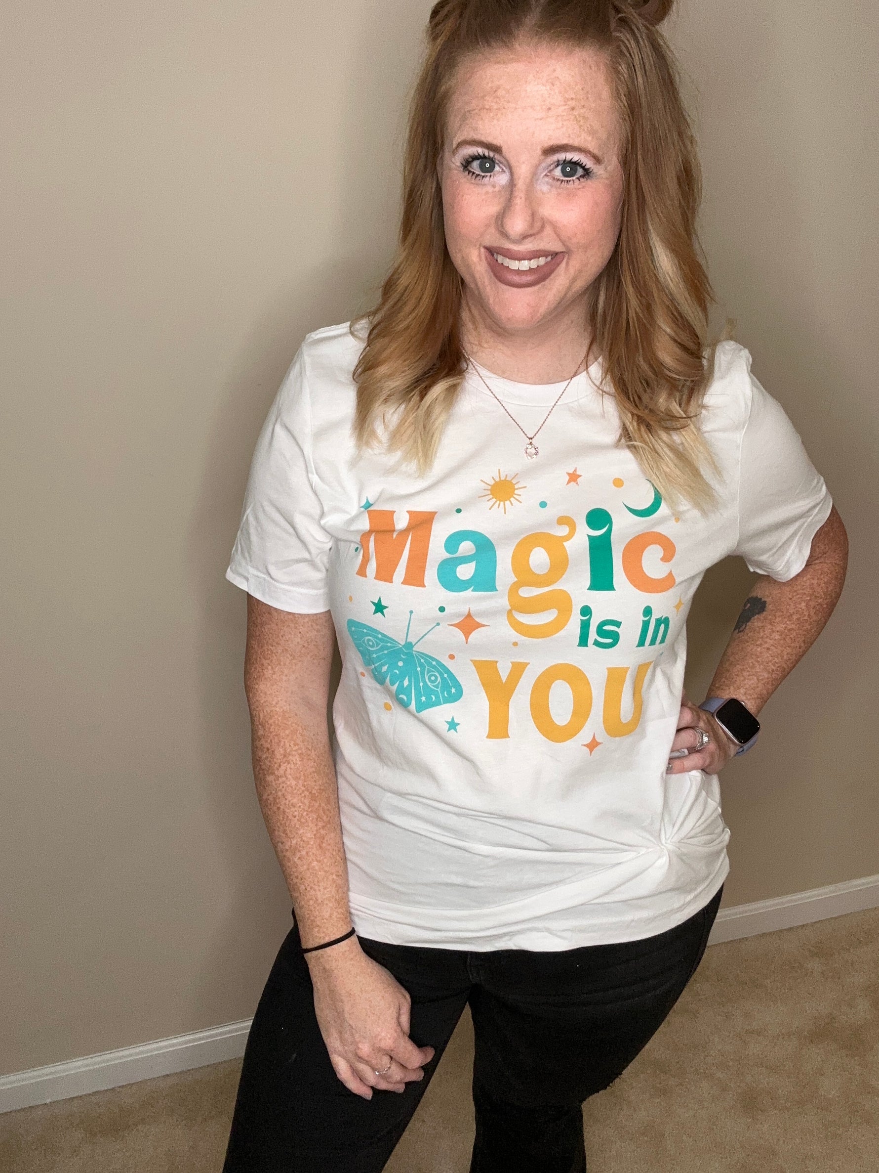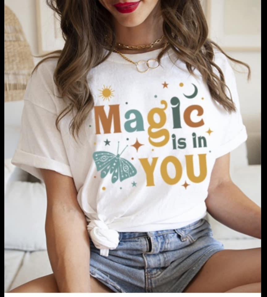 Unleash your inner magic with our women's graphic t-shirt featuring an inspiring message: "The Magic Is In You." This soft, high-quality tee is designed for comfort and style, with a flattering fit that makes it perfect for everyday wear. The bold, whimsical lettering adds a touch of enchantment, reminding you and everyone around you that true magic comes from within. Pair it with jeans, skirts, or your favorite casual wear for an effortlessly chic look that empowers you wherever you go.