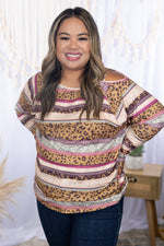 This long sleeve features multi-colored, and multi-patterned stripes. With colors of hot pink, cheetah print, & a contrast of reverse cheetah print you will stand out of the crowd with this top if you Dare To Tame.