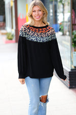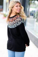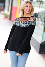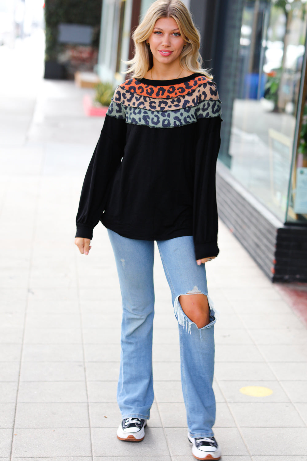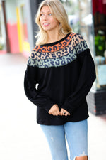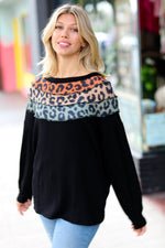 Made with super soft French terry and reverse stitch details, this unique sweater pullover combines rust, mustard and olive leopard waffle print across the chest. Spice up your wardrobe this season!