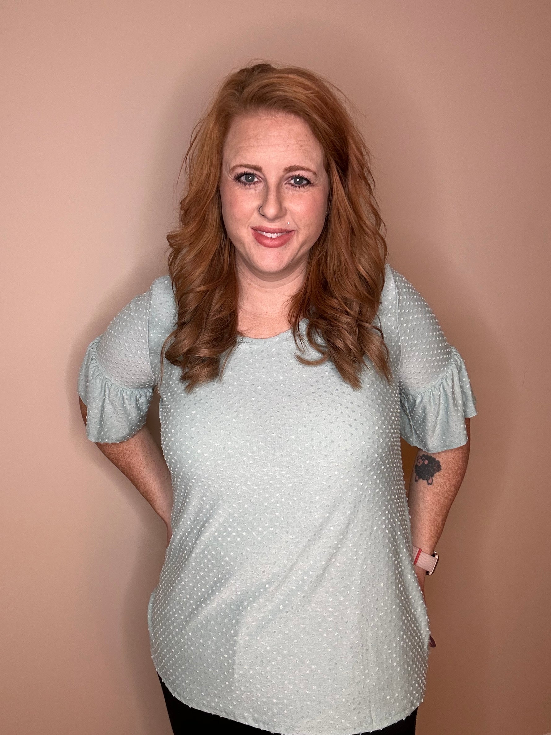 Adorn yourself in this adorable dotted top featuring charming flared sleeves. Made from Swiss dot material, it offers a relaxed fit for ultimate comfort. Perfect for adding a touch of whimsy to your wardrobe, this top effortlessly combines style and ease.