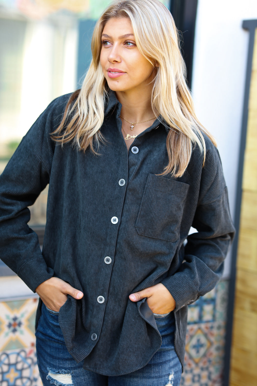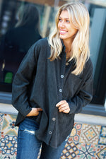 Update your basics with this collared oversized corduroy shacket with side slits, front chest pockets and a button-up closure. Designed with a hi-lo hem and long button-cuff sleeves, step into fall with style with this mid-weight shacket!