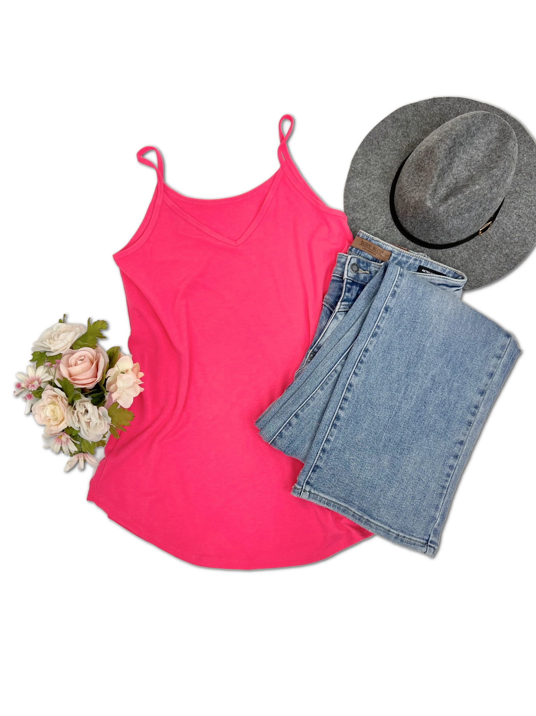 Get ready for double the fun with the Amber Reversible Tank in pink! This versatile tank features a v-neck OR scoop neck and is reversible from front to back. With spaghetti straps and a relaxed fit, it's perfect for any summer adventure. Plus, the rounded hem adds a touch of playful style. Talk about a win-win!