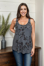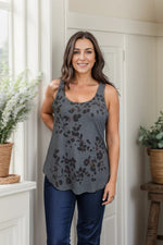Add a touch of whimsy to your wardrobe with our Floral Shadows tank top. The round neckline and charcoal color provide a casual yet stylish look, while the black floral detail adds a playful pop. Perfect for any laid-back occasion!