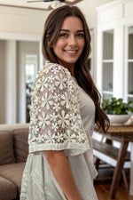 You'll really wanna make this top yours! Featuring short sleeves and detailed lace inserts on the sleeves, a square neckline and a peplum hem that adds a bit of drama to the relaxed fit—it's for special occasions and everyday styling at once!