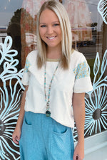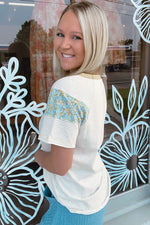 White Stripe Floral Insert Sleeves Contrast Round Neck Tee