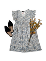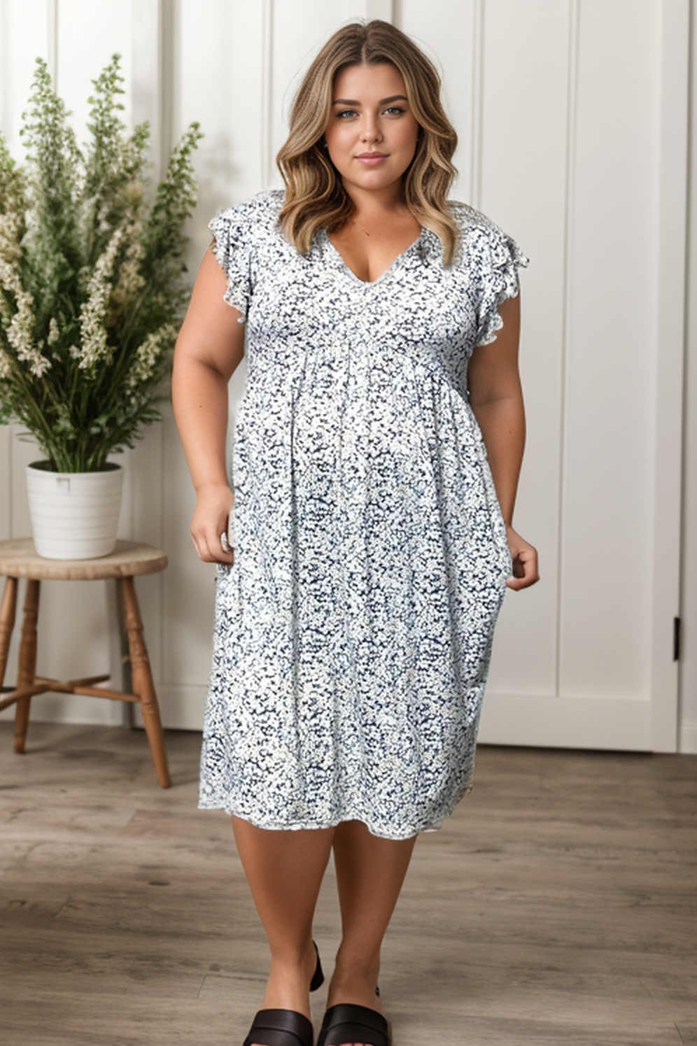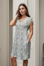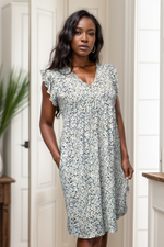 Introducing the Ocean Eyes Dress - Bulgari fabric and playfully printed with blue florals. The v-neck and babydoll style create a flattering silhouette, while the double ruffled sleeves add a touch of whimsy. With the added convenience of side pockets, this midi dress is both stylish and functional.